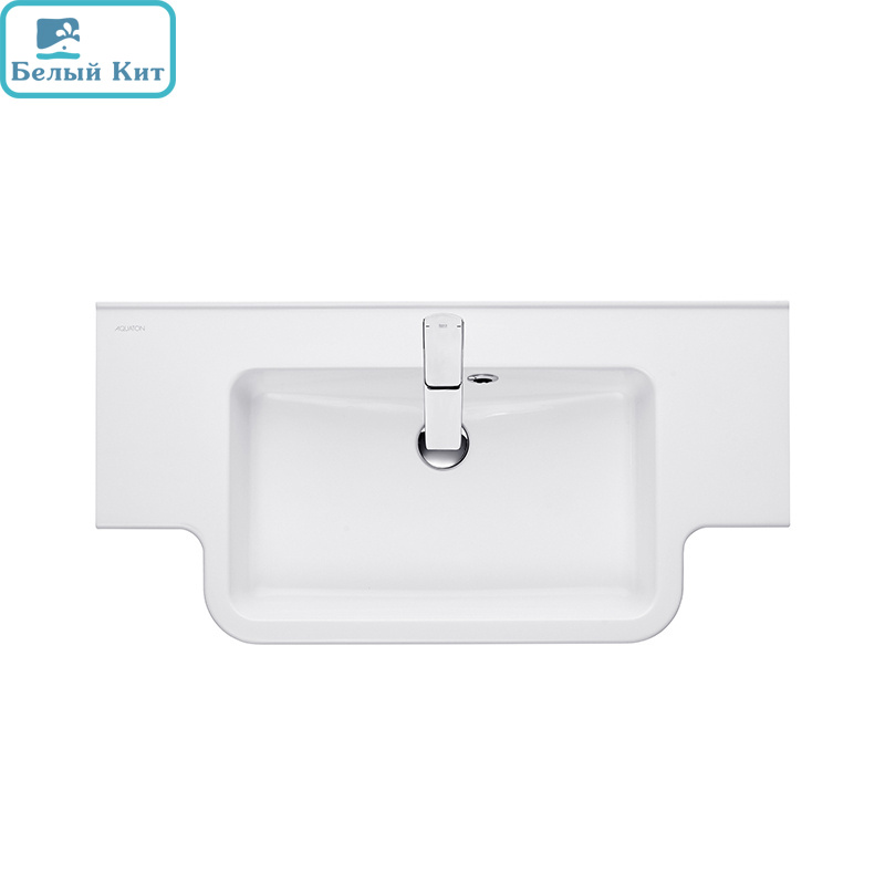 Изящная прямоугольная раковина со смещенной чашей. Оснащена дозатором для жидкого мыла.